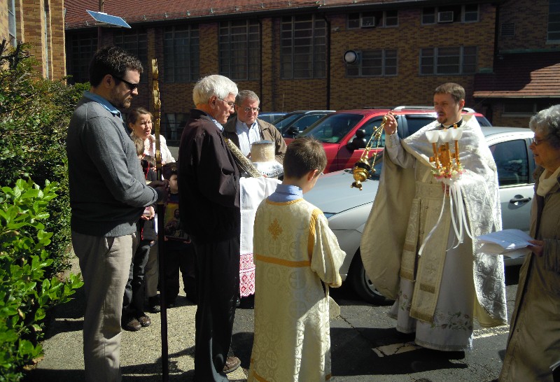 Bright Monday was a beautiful day and following Divine Liturgy, a procession left the church and walked around the building. Father Igor read Gospel passages on each side of the church and then blessed the church and people at each side. Please note: to enlarge the pictures, please move your curser slowly over the first, or any, picture especially around the edge of the photo until you find the hand with the pointing finger. Click on the hand and you should be able to enlarge the photo. When you have the enlarged photo, just click on the arrows under the picture to go on to the others.