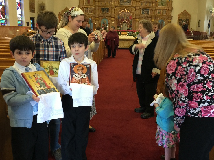 Monday morning was a bit dreary, but spirits were high and bright at St. John’s. Our celebration of the Resurrection of our Lord and Savior Jesus Christ continued with Divine Liturgy followed by a procession around the church. Children who were present carried Icons around the church as we heard the Gospel and blessed the Church building. Father’s blessing was added to sprinkling received from above. Pictures follow of the procession and the children.